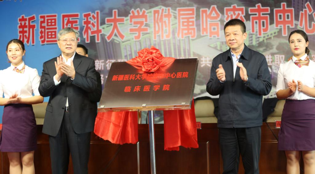 新疆医科大学党委书记高发水和哈密市委书记卢蜀江共同为新疆医科大学附属哈密市中心医院、新疆医科大学哈密市中心医院临床医学院揭牌。