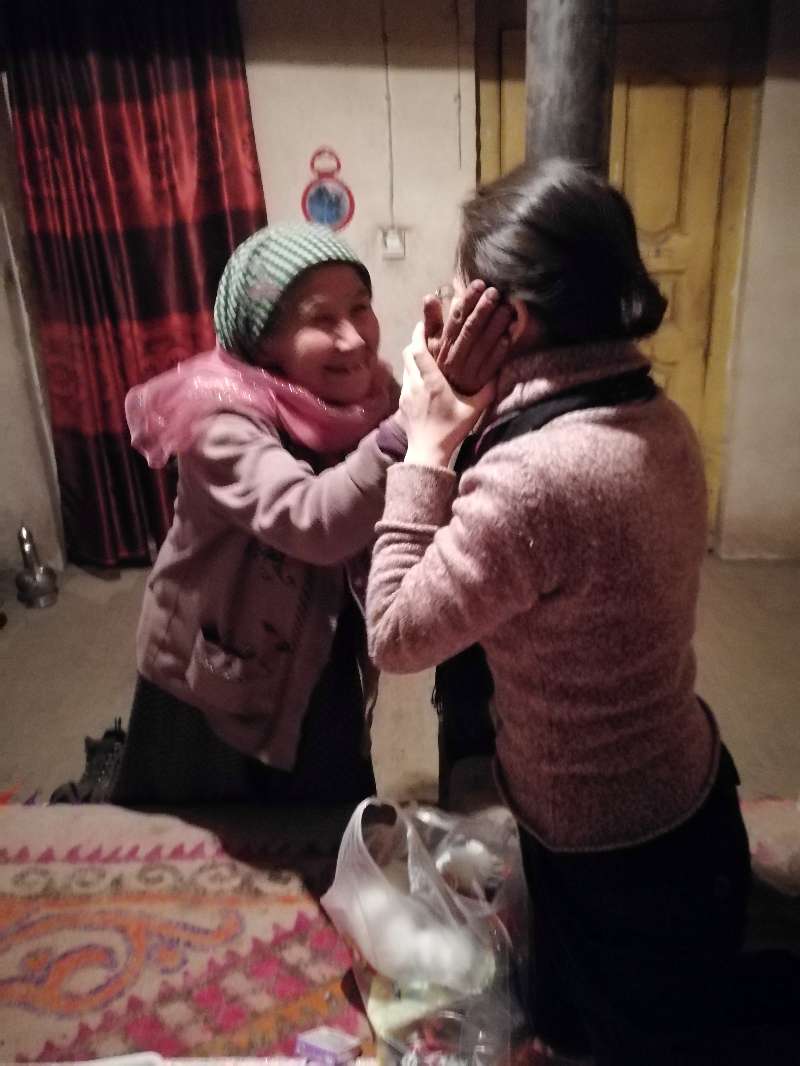 结亲干部王郁在上次来探望吐热汉大妈时,听说她的眼睛时而会有些不舒服,见风会流眼泪。她把这件事记在心里,回医院后专门咨询了眼科专家。这次回来探亲,王郁专门给吐热汉大妈带来了滴眼液,并教大妈如何点滴,还仔细交代说:“吐热汉大妈,一定要记住,眼睛不舒服的时候可以滴它,滴完后用手腹轻轻地按摩眼周,千万不要着急睁开眼睛。平时不要用眼太多,外面风大出门最好裹纱巾,这样风沙就不容易进眼睛里了。”边说着边帮吐热汉大妈按摩着眼睛周围。当吐热汉大妈慢慢睁开眼睛时,王郁拿出了早已准备好的红丝巾围在了吐热汉大妈的脖子上,大妈愣了几秒种后不好意思地说:“这个……太鲜艳了吧。”她用双手捧起王郁的脸,满眼都是慈祥的爱和温暖,嘴里不住的说着:“热合买提,热合买提……”。
