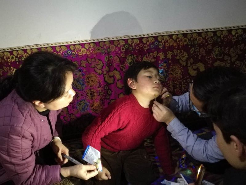 12月25日,在墨玉县扎瓦镇胡木旦村,我们来到新疆医科大学结亲干部阿巴拜克力•米吉提的亲戚吐迪尼亚孜汗•依斯刊达尔的家,62岁的吐迪尼亚孜汗老人时常有头晕目眩的症状,结亲干部、援疆医生胡玉良院长为她测量了血压,并详细为她讲解了服药方法和注意事项。走进亲戚古瓦尔妮萨•麦麦提吾普尔家时,我们发现亲戚躺在床上,身体不适。新医大二附院的李国华副院长仔细检查了她的病情,并查看了全部的MRI片和CT片,援疆干部胡玉良院长查阅了全部病历,并做了重点拍照,准备带回去做进一步研究,用细致的诊断和指导,给亲戚切切实实的关怀和帮助。