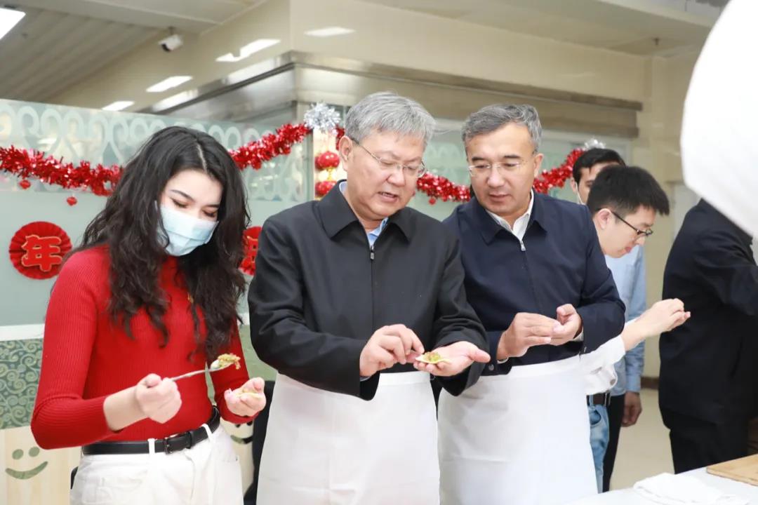 1月31日下午,家家户户正在准备年夜饭的时候,新疆医科大学新医路校区的学生餐厅里洋溢着一片欢声笑语。校领导高发水、凯赛尔·阿不都克热木、李勇生、王爱民等来到同学们中间,和留校过年的新医学子们一起包饺子、演节目、吃年夜饭,共同欢庆虎年新春的到来。
