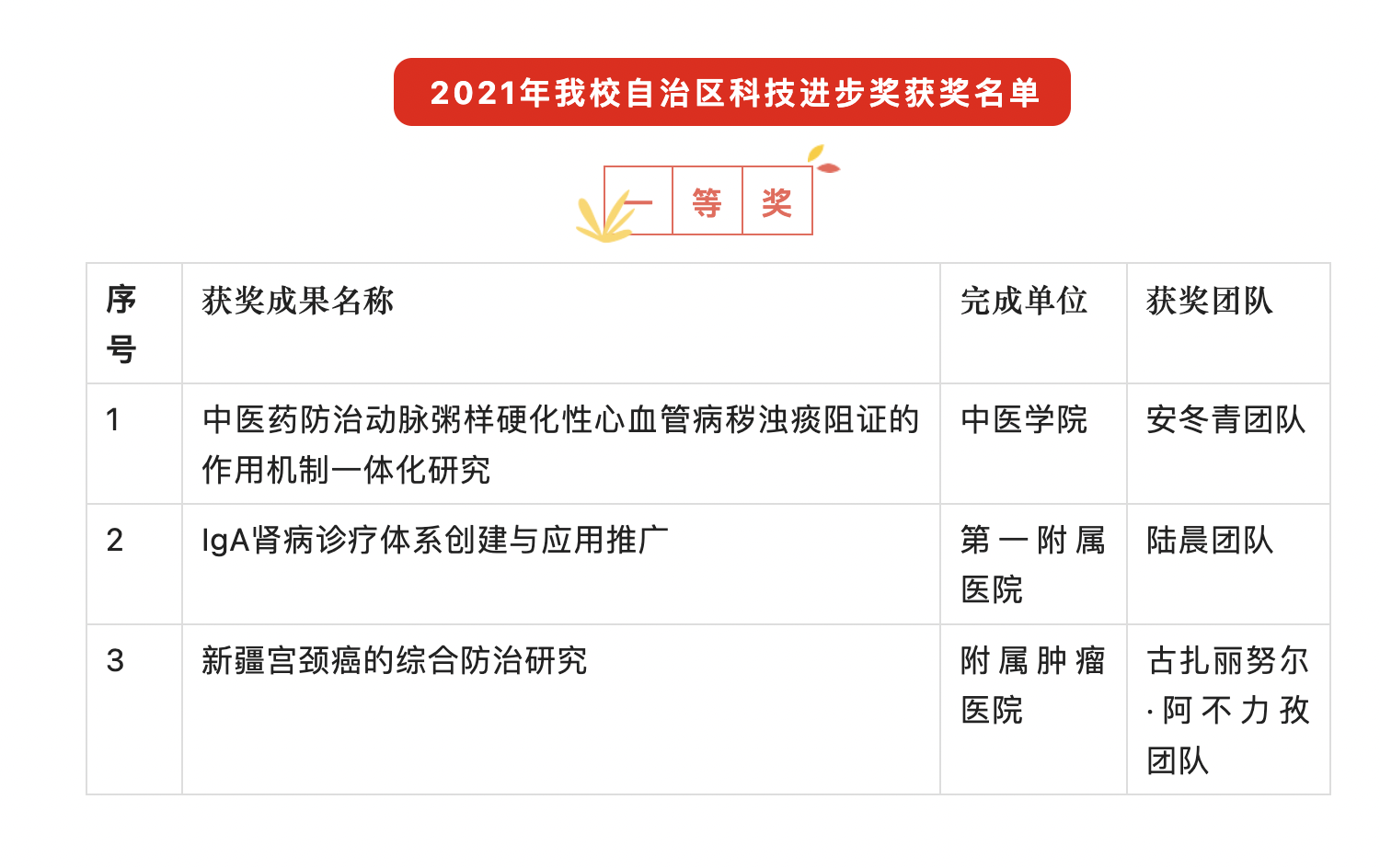 4月29日,自治区召开科技创新大会,隆重表彰了获得2021年度自治区科学技术奖的科技成果和特等奖获奖人员。新疆医科大学共有17个团队的科技成果获得了2021年度自治区科学技术奖,并连续7年获得2项以上自治区科技进步奖一等奖。