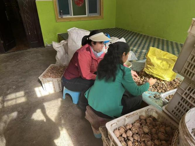 巴哈尔古丽·阿卜杜拉家中,结亲干部们宣讲党的各项惠民政策,了解了家庭具体工作情况,询价家里有什么困难。为了帮助当地村民增收致富,大家纷纷开始购买亲戚家的核桃,通过发朋友圈、联系内地的朋友的方式千方百计帮助亲戚拓宽增收渠道。