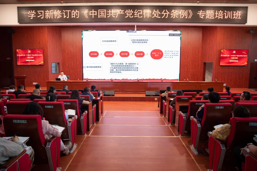 学校各二级党组织紧密结合医疗卫生事业、高校教育教学和本单位党员师生的思想、学习、工作实际讲党课,力求把相关纪律规定讲准,把具体要求讲透。校党委党校举办“新提拔干部、年轻干部、关键岗位干部纪律教育培训班”和组织人事干部能力提升培训班,课程中均设置《条例》专题辅导、警示教育片等党纪党规内容,教育引导党员干部把好“思想关”,念好“紧箍咒”,夯实清正廉洁思想根基。第三附属医院党委、第七附属医院党委、口腔医学院党委严格落实党组织书记讲党课,课上观看《蜕变》《忠诚与背叛》等医疗反腐警示教育片,加强医疗领域反腐倡廉力度,观看人数达870余人次。