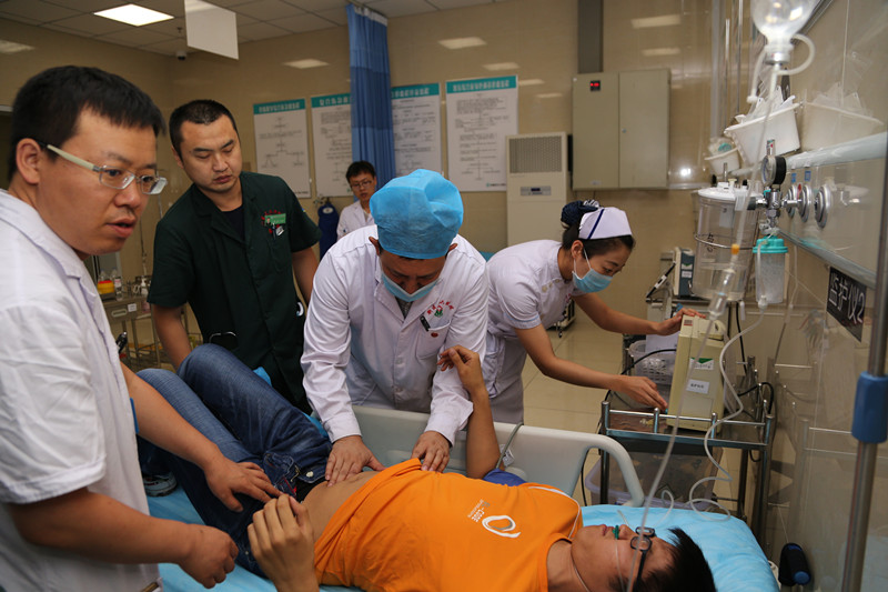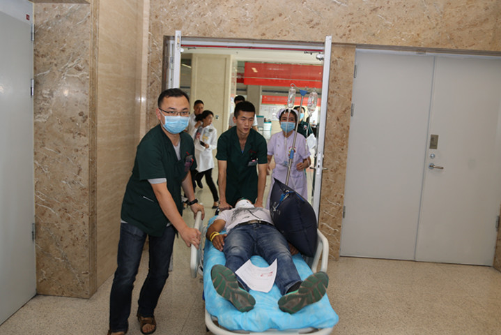 上午11时20分120急救车将8名伤员送到了急诊科大门口,现场安保人员全力维持现场秩序,合理分配了急诊大门口人流。三名伤员中两名为危重伤员、一名为重伤员,急诊科和住院处配合为伤员的信息登记和紧急救治开辟了绿色通道,及时送往抢救室进行抢救。待生命体征稳定后紧急送往了手术室进行手术。经过50分钟的紧张救治分诊,最终伤员分别被收治到ICU、普外科、骨病矫形外科和脊外一科。救治分诊过程中,还穿插演练了应急设备调配、血液和急救药品临时紧急调配、电梯故障的应急演练。