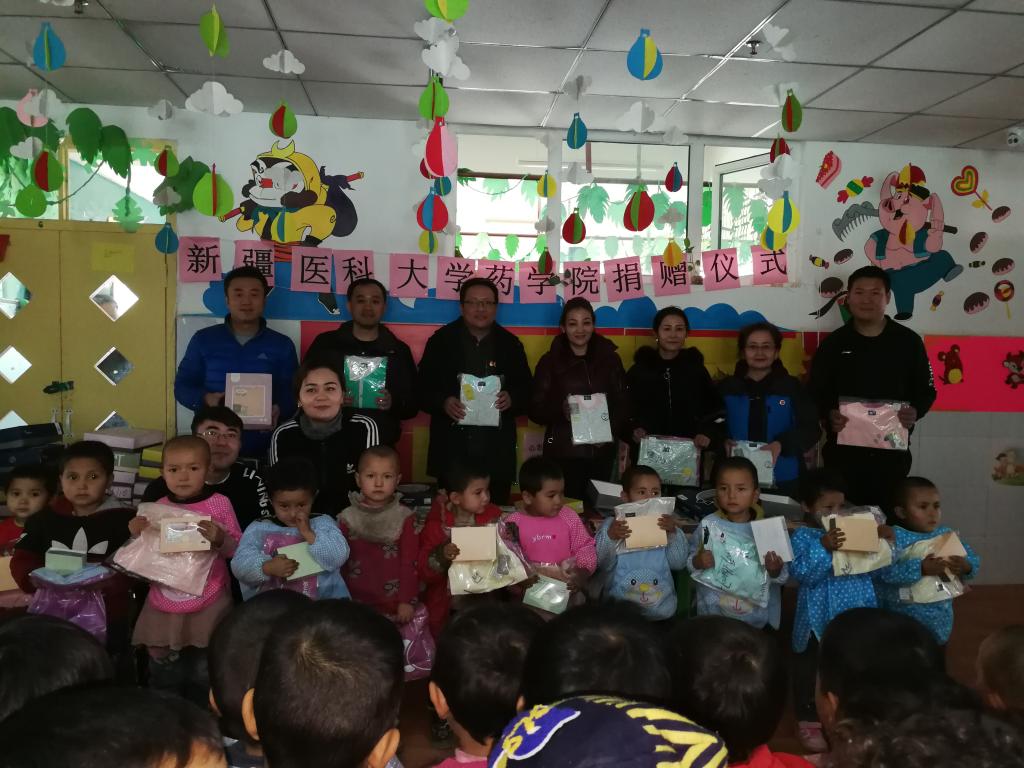 此次捐赠的爱心礼物,是药学院的教职工们向贫困家庭的孩子们送出的关爱和温暖。有保暖内衣81套、纯棉背心81条、纯棉内裤162条,还有各种孩子们的新衣物134件、鞋子15双、书包3个、玩具1包,共计善款7500元,这些爱心礼物为孩子们解决了燃眉之急,也为全体孩子们上了一堂生动的爱国和感恩教育课。在爱心捐赠仪式上, 小朋友们以一曲响亮的“歌唱祖国”表达了对新疆医科大学叔叔阿姨们的感恩之情。