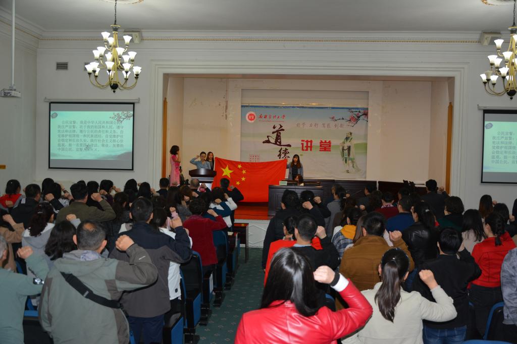 4月26日下午,由计划财务处主办、国际教育学院、审计处、资产处协办的道德讲堂活动如期举行,各学院、处室的教职工和学生代表百余人参加了此次活动。