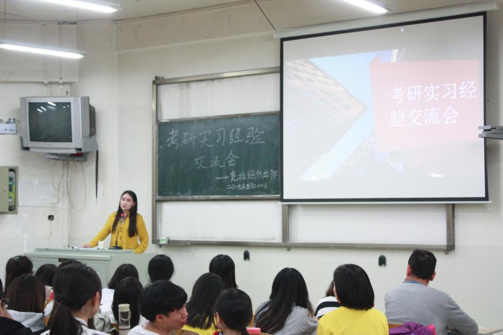 新疆医科大学克拉玛依学院北校区于5月26日晚开展了“分享•交流•进步”考研、实习经验交流会,邀请伊木让•哈米提、杜家虞、陈泰安等七位分别被新疆医科大学、苏州大学等四所院校录取的同学分享考研经验,肖星宇、依克热木•卡的尔等四名优秀实习生代表分享实习经验,助力北校区2015级临床医学学生们备战即将面临的考研和实习。