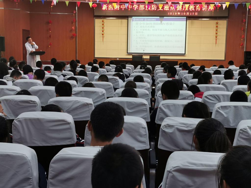 10月17日,新疆医科大学附属中学举办了“关爱生命,拒绝艾滋”的健康教育讲座,邀请校医院的潘景仁老师为中学部全体师生们做了一场关于艾滋病防治的健康知识专题讲座。