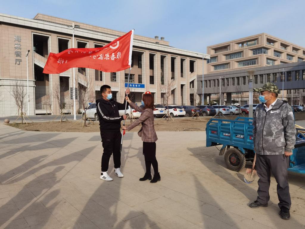 新疆医科大学校团委负责人为维吾尔医学院2017-1班、维吾尔医学院2018-1班、维吾尔医学院2019-01班、维吾尔医学院2020-1班、维吾尔医学院志愿者协会授旗,各班级代表及志愿者协会代表分别接过旗帜。