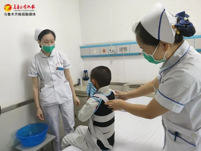 8月16日,在新疆医科大学第二附属医院神经外科,护士正在为术后的患儿穿戴护具,并鼓励她自己洗漱。记者刘薇摄