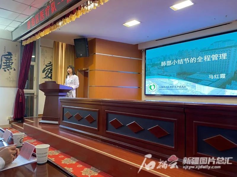 新疆医科大学第四附属医院(自治区中医医院)肺病一科副主任马红霞在吉木萨尔县义诊时为医护人员授课