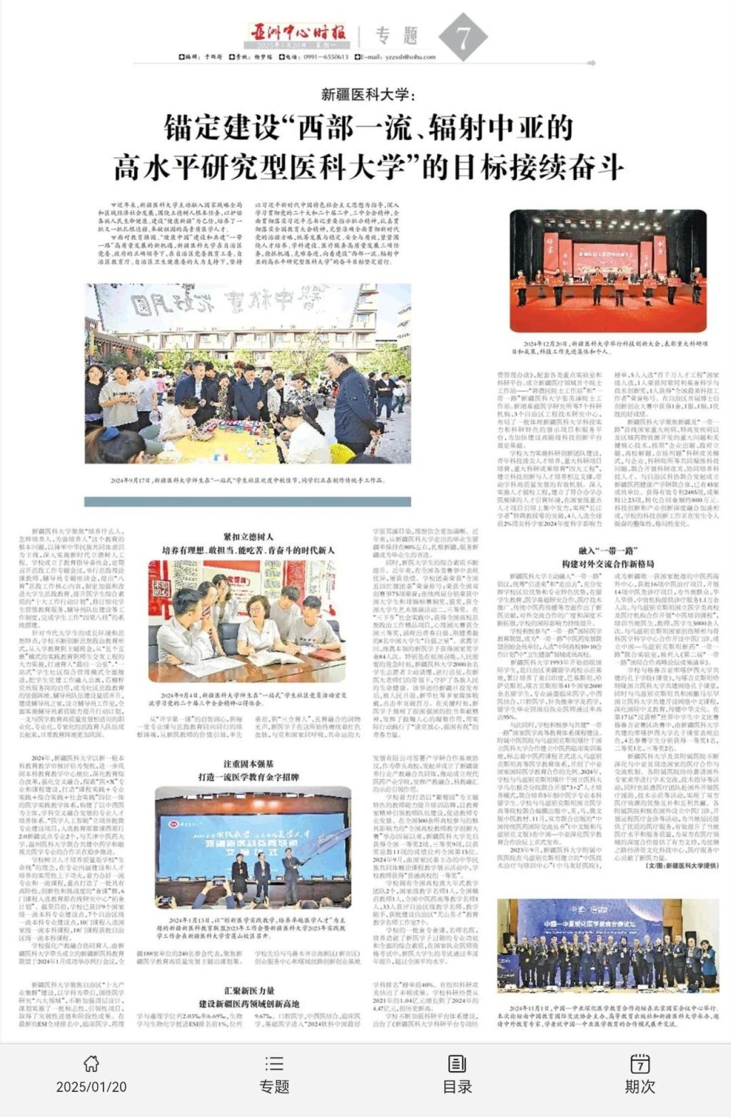 ▼面对教育强国、“健康中国”建设和共建“一带一路”高质量发展的新机遇,新疆医科大学在自治区党委、政府的正确领导下,在自治区党委教育工委、自治区教育厅、自治区卫生健康委的大力支持下,坚持以习近平新时代中国特色社会主义思想为指导,深入学习贯彻党的二十大和二十届二中、三中全会精神,全面贯彻落实习近平总书记重要指示批示精神,认真贯彻落实全国教育大会精神,完整准确全面贯彻新时代党的治疆方略,统筹发展与稳定、安全与质效,紧紧围绕人才培养、学科建设、医疗服务高质量发展三项任务,抢抓机遇、克难奋进,向着建设“西部一流、辐射中亚的高水平研究型医科大学”的奋斗目标坚定前行。