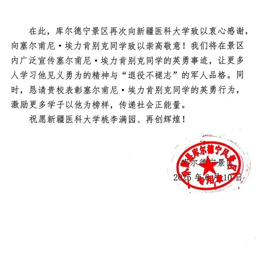塞尔甫尼・埃力肯别克的行为得到了景区管理部门的高度赞扬,景区特地向我校全科医学学院发来了感谢信,对塞尔甫尼・埃力肯别克的英勇事迹表示肯定与感谢。同时,在现场游客中也引起了强烈反响,大家纷纷为他的英勇之举点赞。