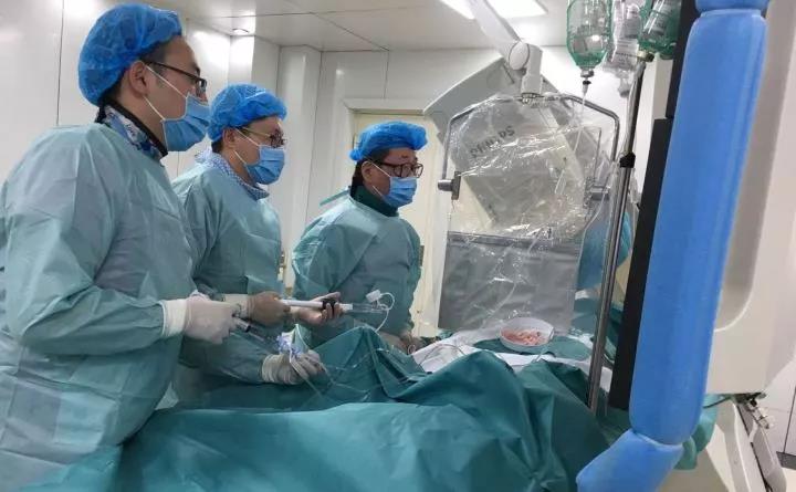 4月16日,新疆医科大学附属中医医院(自治区中医医院)心内二科主任武刚(右)为患者实施生物可吸收心脏支架植入术