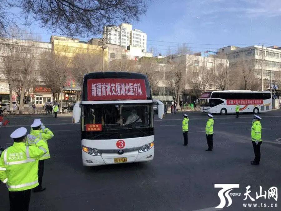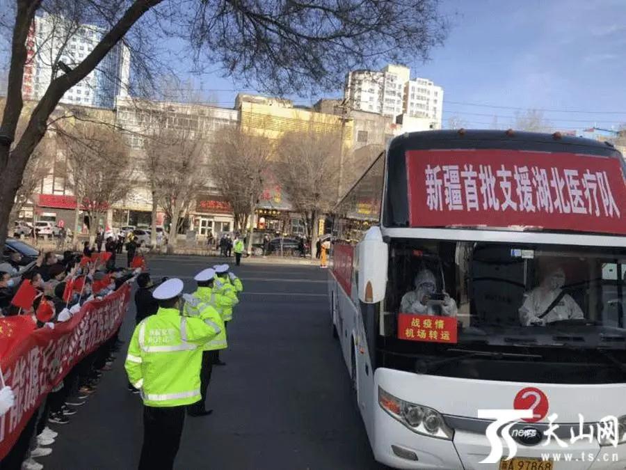 新疆首批支援湖北医疗队队员乘坐大巴车离开乌鲁木齐地窝堡国际机场。
