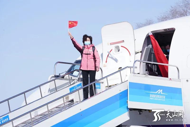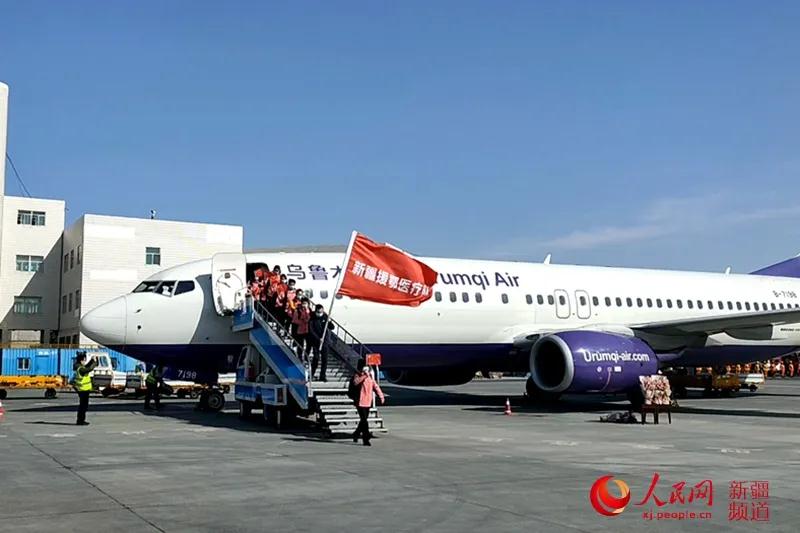 新疆第一批支援湖北医疗队队员依次走下飞机。
