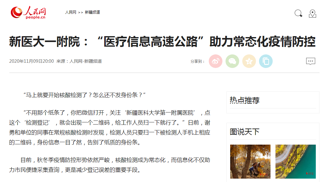 “进入秋冬季以来,常态化核酸检测任务加重,我们不仅承担院内基本诊疗工作,还需要承担各社区居民、学校、企业复工复产等核酸采集任务,所以设计开发了信息化核酸检测系统,为市民和医务人员提供双向便利。”新疆医科大学第一附属医院(以下简称新医大一附院)信息管理科科长陈曲说。