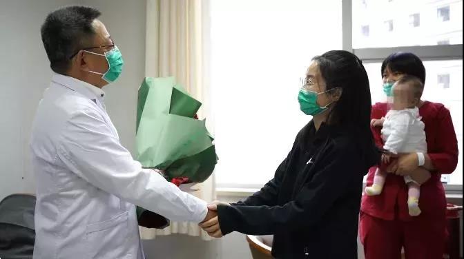 新疆医科大学第一附属医院院长陆晨(左二)与儿科中心医护人员一起看望即将出院的小月