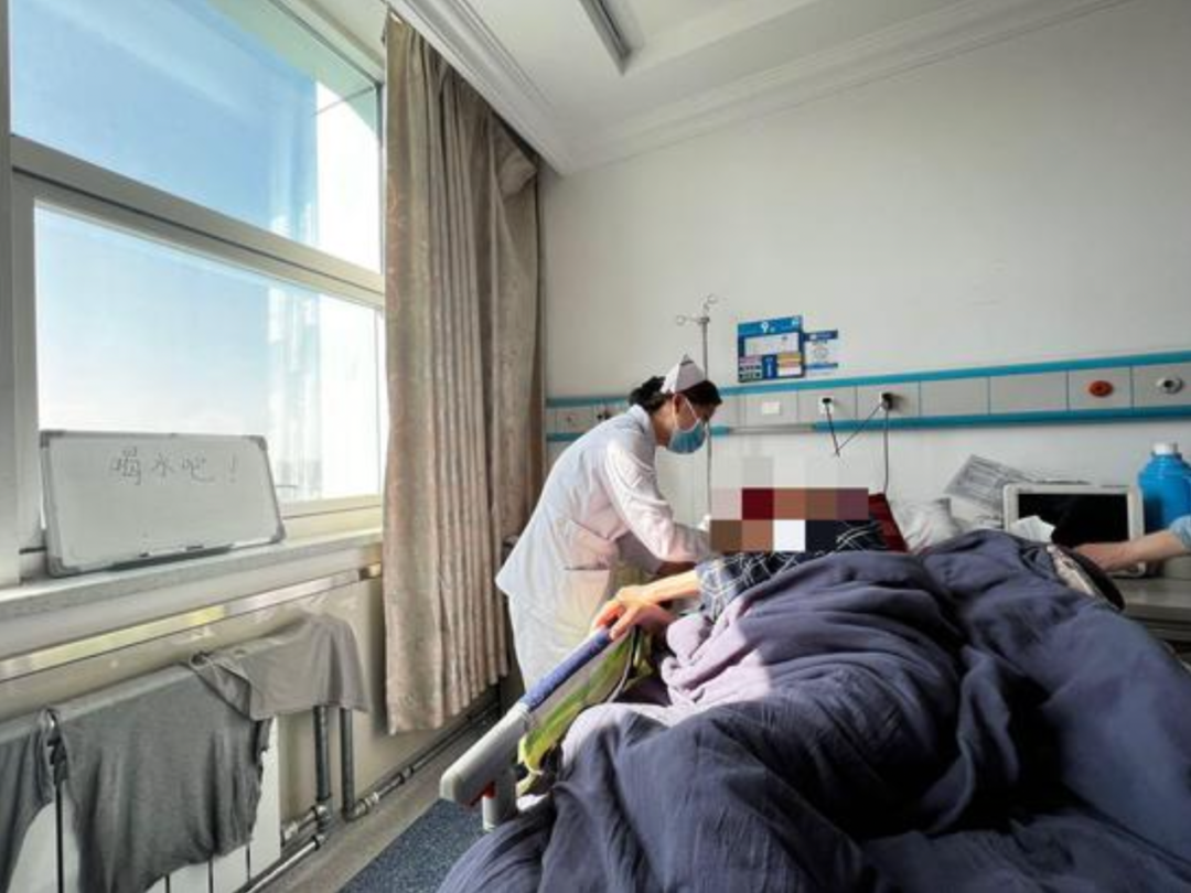入院以来,老人历经三次病危通知,在该院医护人员的照护下,现在可以与医护人员、家属进行简短交流。当天,护士在白板上写下“喝水吧!”的字样,老人微微睁开眼睛,顺势点了一下头。