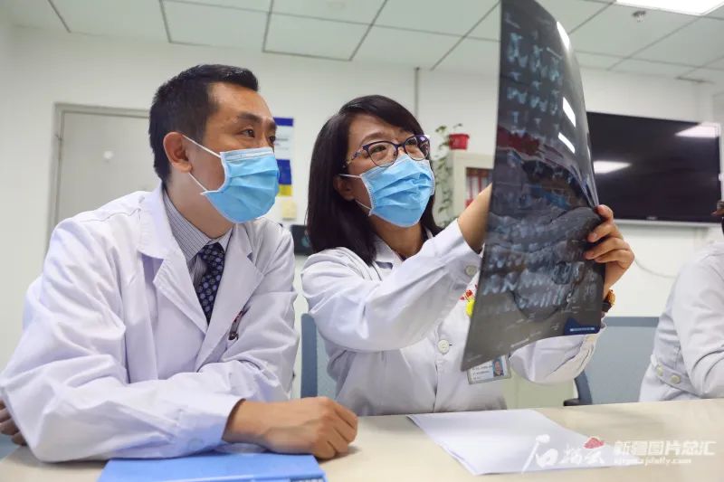 4月15日,新疆医科大学第一附属医院消化血管外科中心主任邵英梅(右)和肝胆包虫外科副主任医师蒋铁民讨论患者病情。石榴云/新疆日报记者 仲兆丰摄