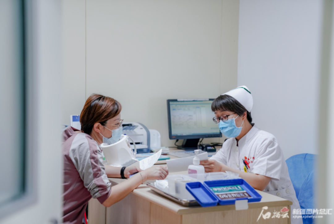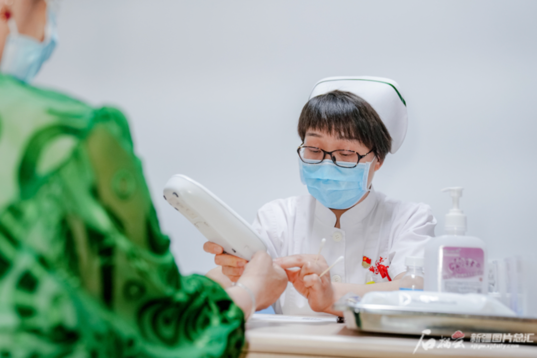5月7日下午,新疆医科大学第一附属医院糖尿病护理门诊护士长徐静为患者测量血糖。石榴云/新疆日报记者 豆兴军摄