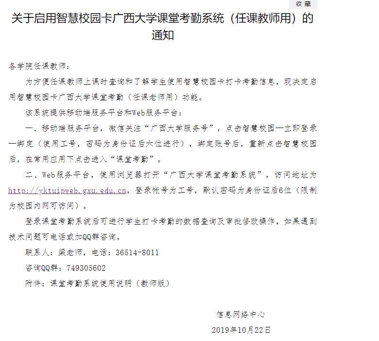考勤系统使用方法:请查阅文件系统内《关于启用智慧校园卡广西大学课堂考勤系统(任课教师用)的通知》