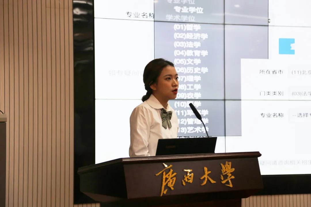 首先,李欣蔚同学从选择合适的院校说起,给同学们分析了选择院校的主客观因素,特别强调了在报考院校时要注意院校报录比、专业门类类别和专业名称之间的关系的重要性。同时,她还给同学们分享了她考研路上遇到的困难和犯过的错误。