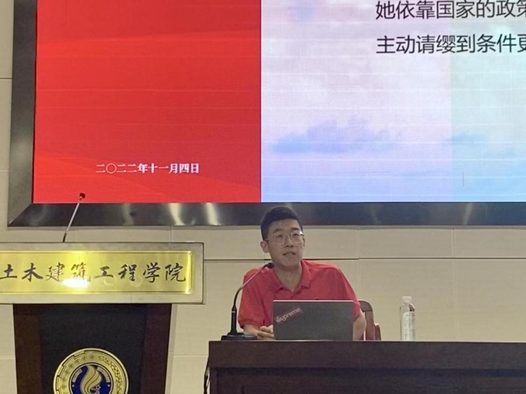 分享结束后,土木建筑工程学院团委书记李道洋老师发表了讲话。在讲话中,他深入浅出地讲解了党的二十大的主题、内容与重大意义,并就党的二十大报告中的新观点、新论断、新要求分享了学习体会,指出全体党员一是要加强理论学习、提高政治觉悟;二是要胸怀“国之大者”,厚植为民情怀;三是要以身作则,充分发挥党员先锋模范作用,做学习宣传贯彻党的二十大精神的先锋队与生力军。最后,他勉励大家要以党的二十大精神为指引,坚持听党话、跟党走,坚定理想信念、增长本领才干,为实现第二个百年奋斗目标而不懈奋斗。
