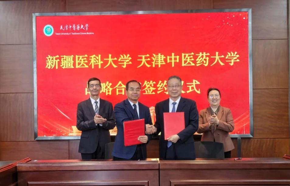 新疆医科大学党委常委、副校长赵社文与天津中医药大学党委常委、副校长郭义代表两校签订了《天津中医药大学 新疆医科大学战略合作协议》。