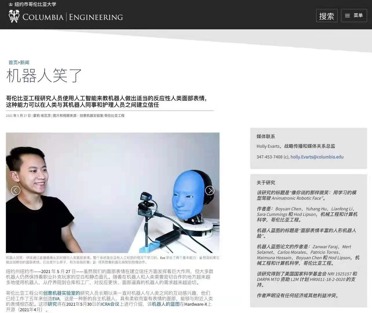 机器人笑了!它叫EVA,有一张蓝色的脸。美国哥伦比亚大学(Columbia Engineering)创意机器实验室(Creative Machines Lab)近日发布的这一消息迅速在全球范围内传播开来。您以为,您正在看的是一条科技新闻,或者国际新闻?都没错,但远远不够,因为,这实际上也是一条咱“嘉”的新闻。