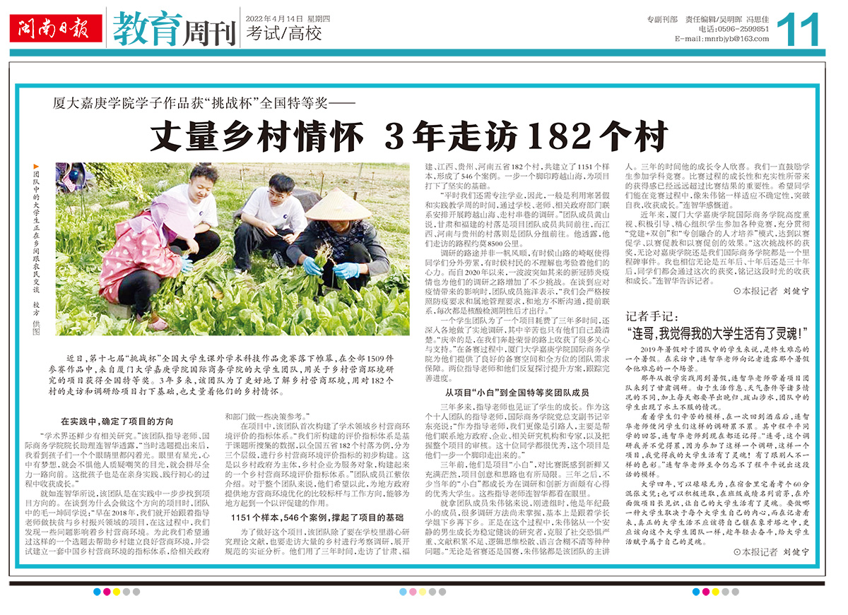 近日,第十七届“挑战杯”全国大学生课外学术科技作品竞赛落下帷幕,在全部1509件参赛作品中,来自厦门大学嘉庚学院国际商务学院的大学生团队,用关于乡村营商环境研究的项目获得全国特等奖。3年多来,该团队为了更好地了解乡村营商环境,用对182个村的走访和调研给项目打下基础,也丈量着他们的乡村情怀。
