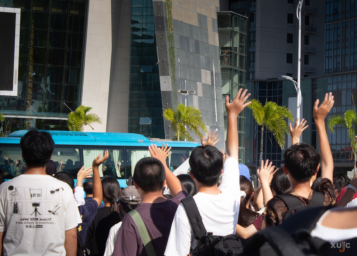 大巴车缓缓开动,新生们静静地伫立在原地,目送着车渐行渐远。