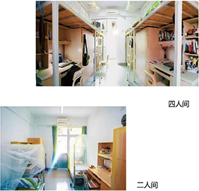 学校的宿舍分为四人间和二人间,可供学生自主选择。大一新生安排入住四人间。每间宿舍均配有空调、电话、校园网及宽带接口。北区、中区为四个宿舍共用一间卫生间,每天有保洁阿姨清扫;南区的宿舍则拥有独立卫生间,由学子自行打扫。卫生间内均配有热水器。