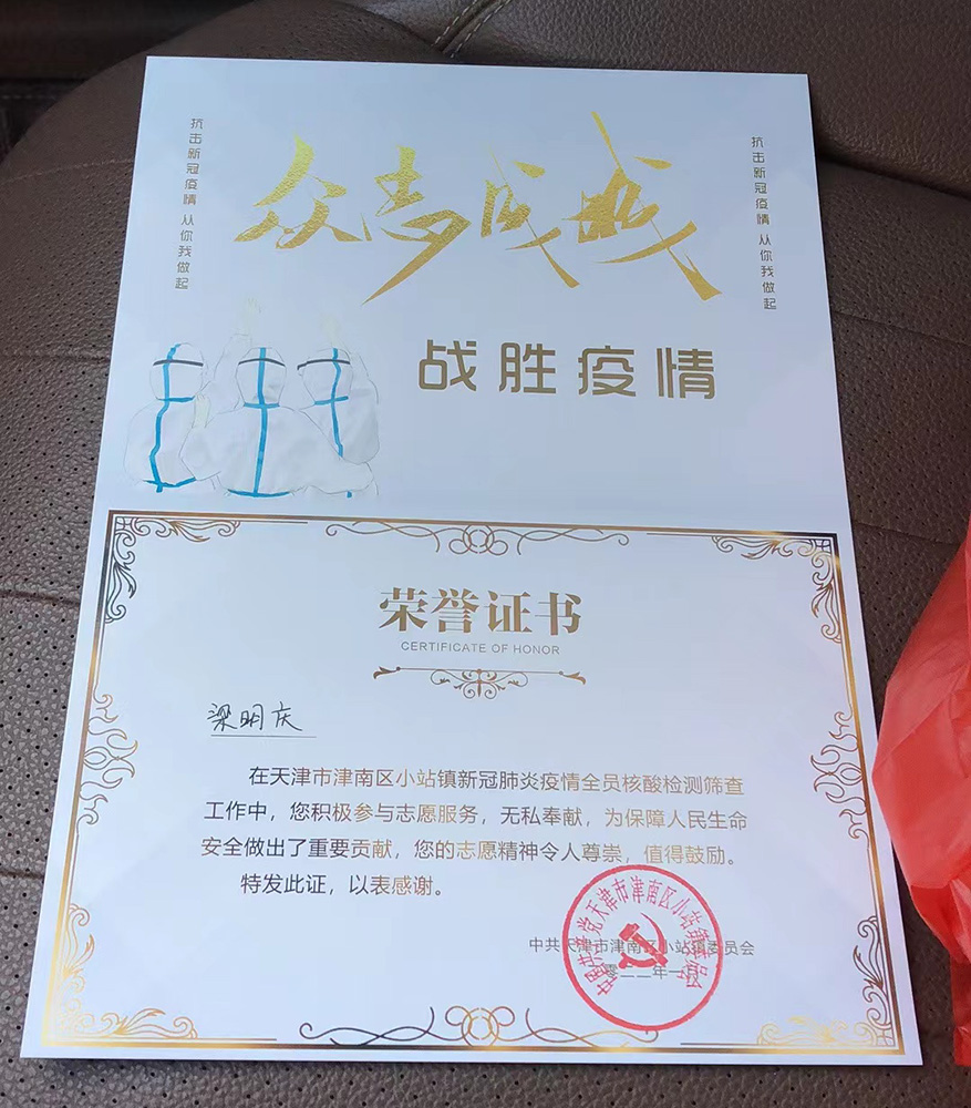 “经过这次志愿者活动,我成长了不少,更感受到了祖国的强大以及全国人民团结一心抗击疫情的中国式温暖。”梁明庆说,这次经历带给他很多感悟和感动。值得一提的是,他还收获了来自中共天津市津南区小站镇委员会的荣誉证书,并点赞他:“您的志愿精神令人尊崇,值得鼓励。”