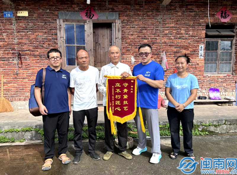 厦门大学嘉庚学院“沉‘靛’千年、青黛见福”唤醒计划团队指导老师唐刚(右二)带领团队走访老匠人,并代表团队为黄凤舟老人(中)颁发锦旗。(摄影:陈睿娱)