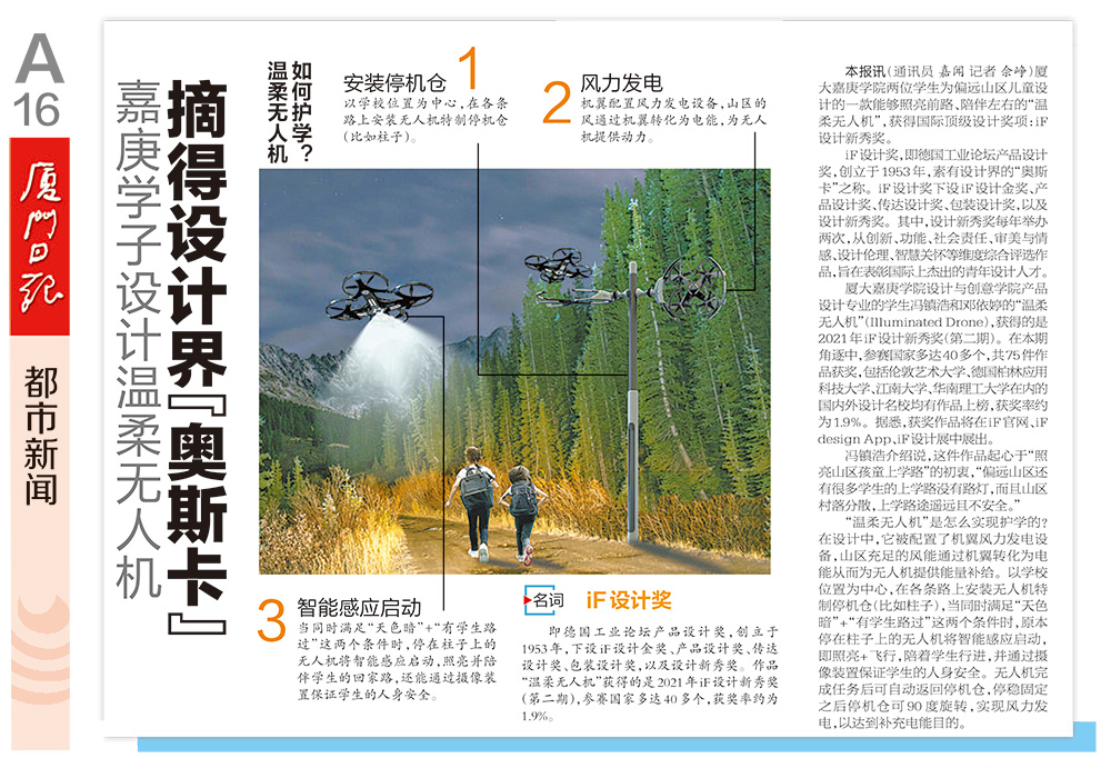 本报讯(通讯员 嘉闻 记者 佘峥)厦大嘉庚学院两位学生为偏远山区儿童设计的一款能够照亮前路、陪伴左右的“温柔无人机”,获得国际顶级设计奖项:iF设计新秀奖。