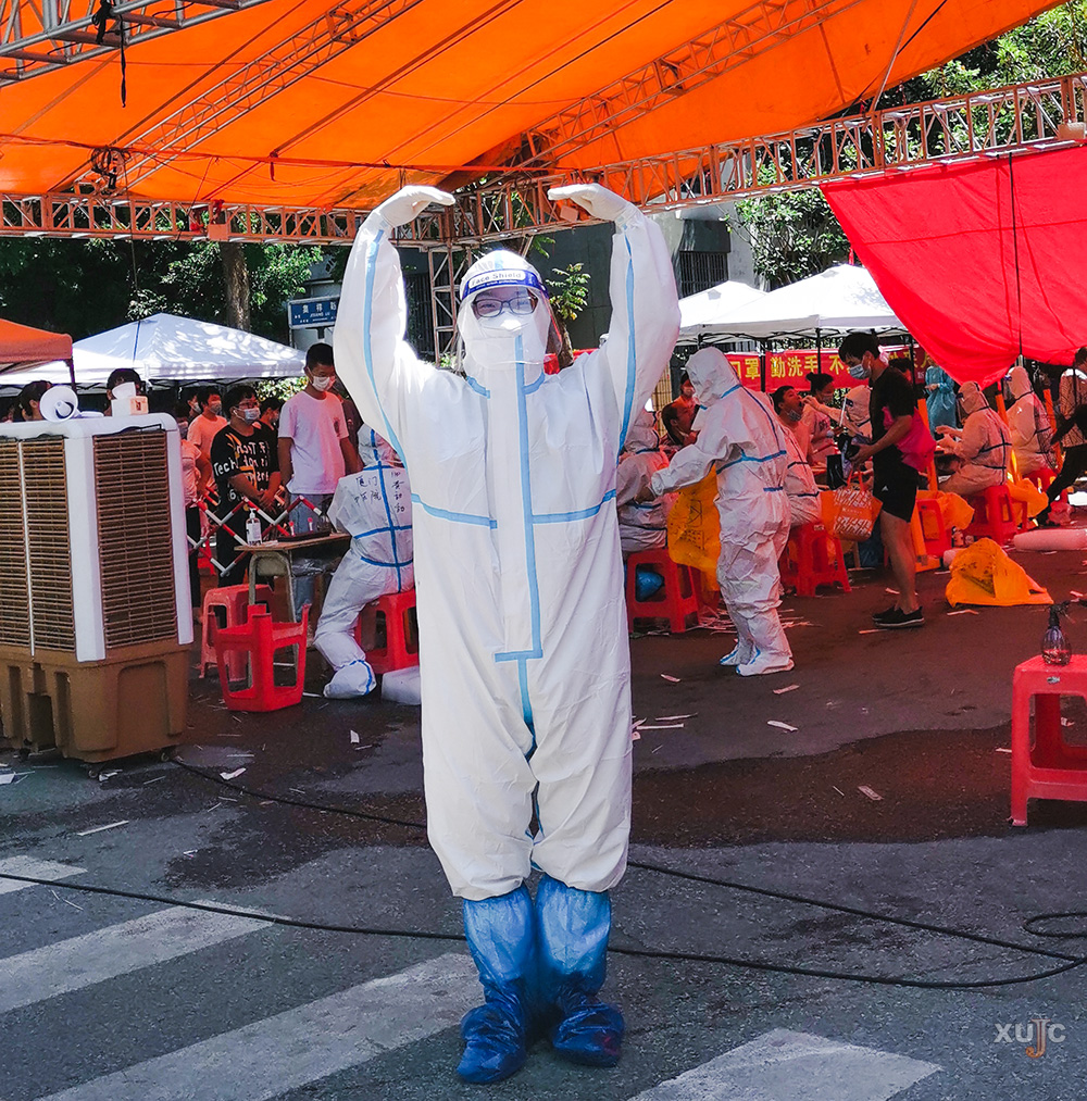 九月同安的天气不是“秋高气爽”,白天的最高温度常常达到37度。而防护服内的温度可以达到50度,甚至是60多度。按照游仁杰的话来说“穿上防护服整个人就像处于一个大火炉里。”身着防护服、长时间待在帐篷底下、长期需要走动,就更加闷热了,游仁杰透露,每当他脱下防护服时,汗水就“哗啦”一下地从里面倒出来。虽然很辛苦,但志愿者们都勤恳地奋战在自己的岗位上。