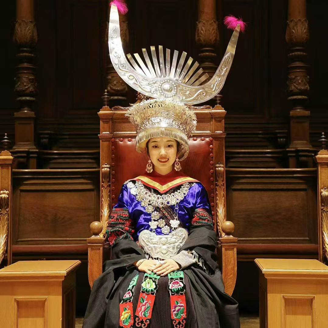 作为来自中国贵州省黔东南州的地道苗族女孩,余天羽早在半年前就有了穿苗服参加毕业典礼的想法。当时,她回到家乡,筹备毕业设计作品的拍摄,家人们把对她的爱与支持化作一针一线的缝制,“直到我要出发,返回英国的前两天,妈妈还在熬夜为我绣布鞋。”余天羽说,这套苗服装满她的两个大号行李箱,“华美的头饰独享一箱。”考虑到要漂洋过海,长距离运输,家人们用白铜代替银装饰,“真银比较昂贵,担心磕了、碰了。”
