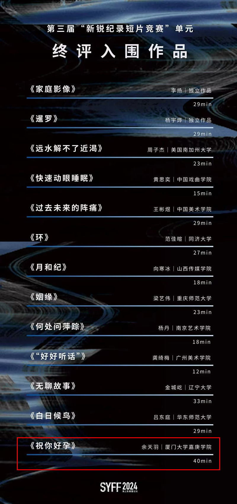 谈及毕业设计作品,有必要提一下余天羽在“嘉”时的毕业设计——由她和林语萱、王莹、施晓阳同学联合主创的40分钟纪录片《祝你好孕》(导演:余天羽 指导老师:陈丽丽)刚刚入围2024年海上影展暨论坛“新锐纪录短片竞赛”单元终评。