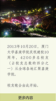 【嘉园微海报】因为在“嘉”[图] 第41期“恰同学少年”校友论坛 福州校友分享职场与创业经验[图] 有一种爱叫毕业十年我回“嘉”为你庆生[图] “嘉园”14岁校友歌会,“嘉”人深情为她打call[图] 【嘉园微海报】校庆倒计时|爱你,千言万语[图] [厦门网]嘉庚学院本周末迎来14岁生日 喊校友回“嘉”吃饭唱歌[图] |