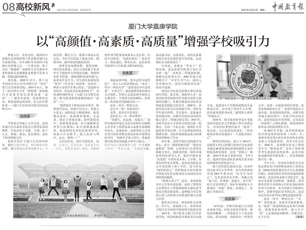 今年3月,中国高等教育学会高校竞赛评估与管理体系研究工作组发布《2020全国普通高校大学生竞赛排行榜》,嘉庚学院位列全国普通高校第169名,民办高校及独立学院之首,这是学生竞赛力的体现。紧接着,高等教育评价专业机构4月发布2021软科中国大学排名。在全国独立学院排行榜中,嘉庚学院位居全国之首,这是对大学办学水平的立体化监测式评价。