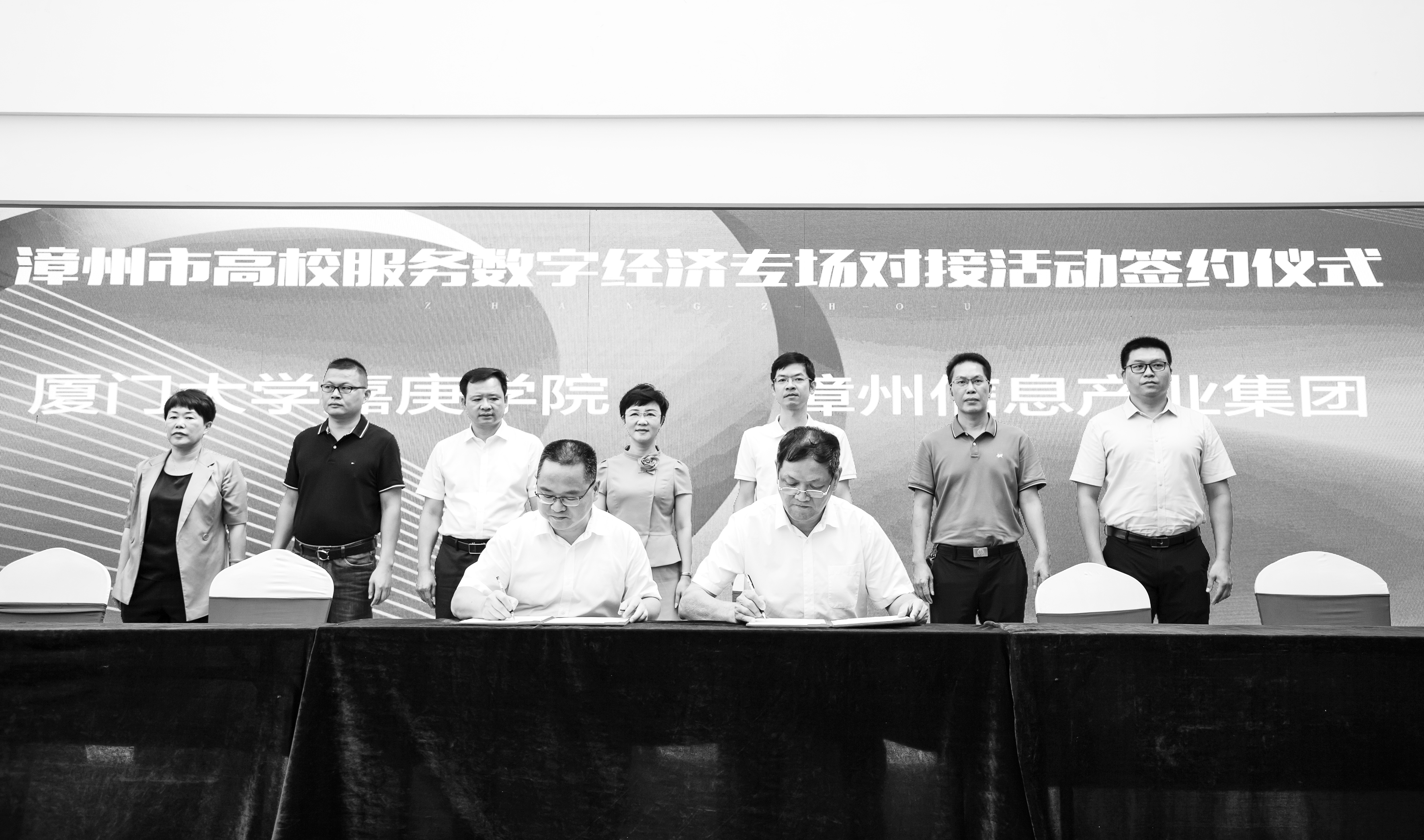 2023年6月,厦门大学嘉庚学院副院长洪永强(右)代表学校与漳州信息产业集团签署了战略合作协议,双方约定从拓展信息化场景应用、工业互联网领域科技成果转化、数字经济领域创新人才培养等方面展开合作。朱鲜艳 摄