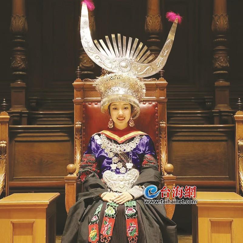早在半年前,余天羽就有了穿苗服参加毕业典礼的想法。当时,她回到家乡,筹备毕业设计作品的拍摄,家人们把对她的爱与支持化作一针一线的缝制。“直到我要出发,返回英国的前两天,妈妈还在熬夜为我绣布鞋。”余天羽说,这套苗服装满她的两个大号行李箱,华美的头饰独享一箱。考虑到要漂洋过海,长距离运输,家人们用白铜代替银装饰,“真银比较昂贵,担心磕了、碰了”。“尊重自己的文化才能获得别人尊重。”余天羽笑称自己因为“民族高定(服饰)”获得了特别的福利,“大大方方当了一次全场MVP!”据介绍,毕业典礼完成后,校方还请她再次入场,“快坐到交椅上,我们重新开灯,给你拍摄!”于是,好美的嘉庚女孩成了第三位在英国爱丁堡大学毕业典礼现场,坐上那把庄重交椅的人,“前两位是校领导”。
