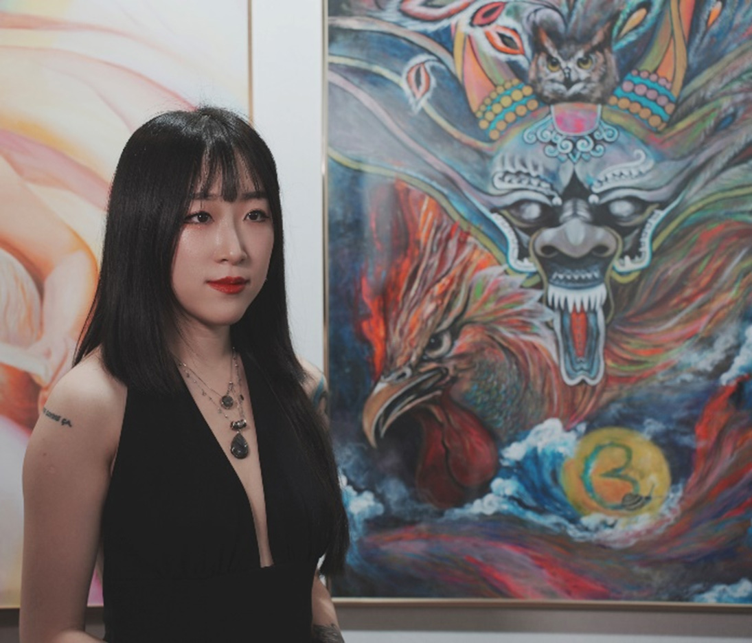 她在创作自述中表示,这幅画是她的心流之作,承载了她对爱情、自然与生命奥秘的深刻思考。龙与鸡的意象,在画面中交织成一幅和谐共生的画面,寓意着新轮回的开始与未知的探索,恰逢2024年是中国农历的龙年,更添一层深意。