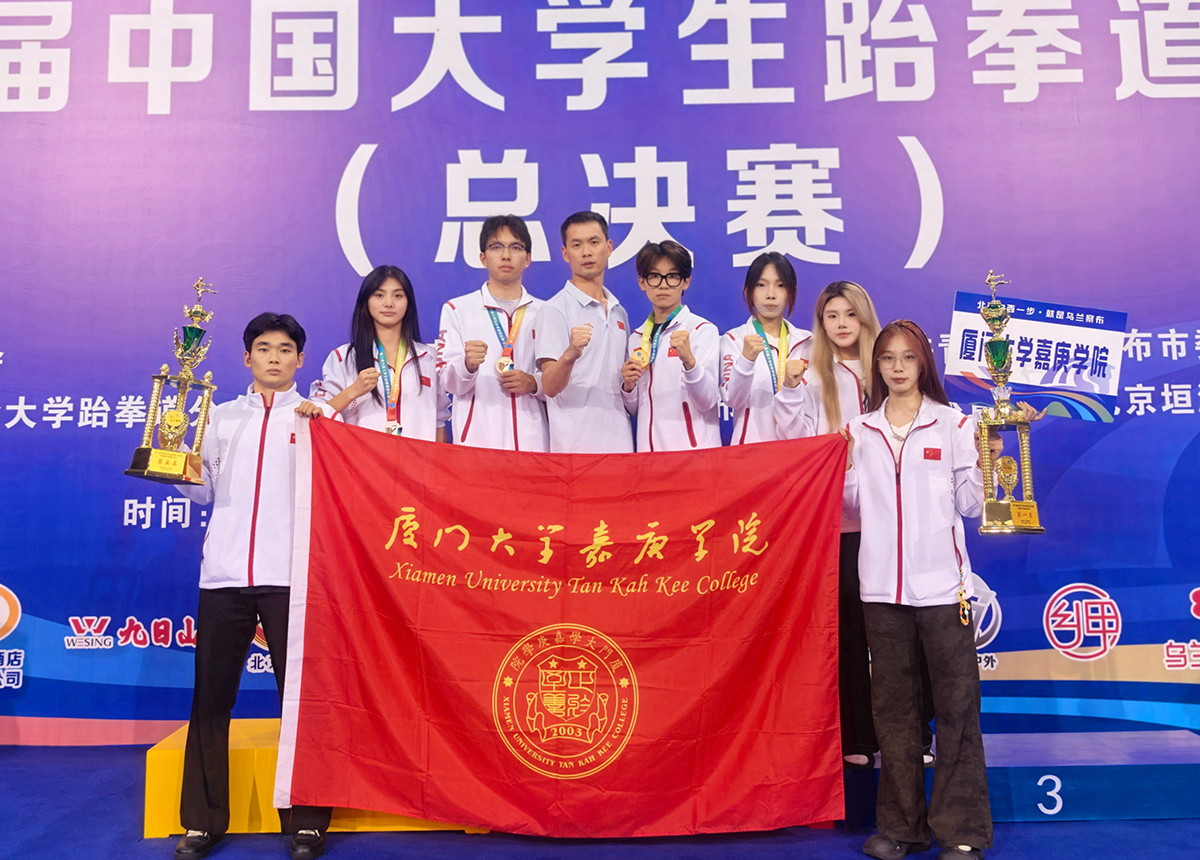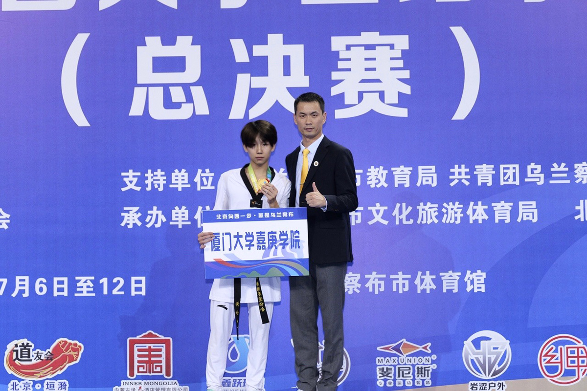 我校跆拳道队由张东强老师担任主教练,校友吴怡萱、王崇林担任助理教练,共同为8名总决赛队员保驾护航。正是有了强大的教练团队和后勤保障,才使得新队员能够轻装上、越战越勇。在南方赛区险胜,并以第五名进入总决赛的龚江琼、杨宁芝是训练不过数月的新兵,但她们在赛场上遇强则强、永不言弃的拼搏精神深深打动现场观众,即使带伤比赛也要拼尽全力取胜,她们用实际行动诠释了体育精神,同时也拼得了两枚珍贵的奖牌。