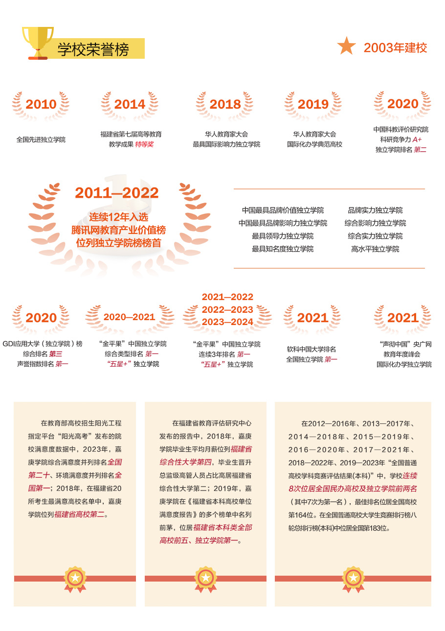 2014年开始,嘉庚学院迈入新一轮跨越发展,提出“教学与科研并举,以有效教学见长”的发展思路,以制度建设与队伍建设为立足点,以实践教学、开放办学、学科建设、科研工作、研究生教育为生长点,打造特色,树立品牌,努力实现成为国内同类高校一流、获得国际广泛认可、以有效教学见长的新型优质高等学校的高远愿景。(相关数据统计截至2025年6月12日)