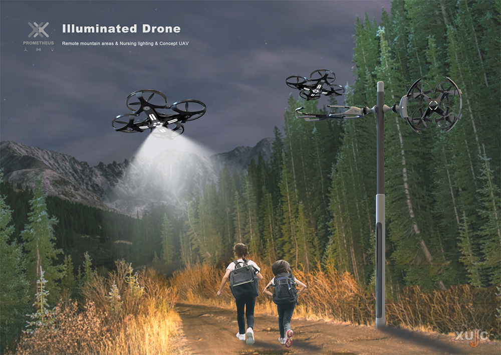 我校获奖作品名为《Illuminated Drone》,是一款针对偏远山区学生走夜路的护学照明概念无人机。Illuminated一词译为发光的,而大家更喜欢叫这项设计为“温柔无人机”。据设计者冯镇浩介绍,这件作品起心于“照亮山区孩童上学路”的初衷。另一位设计者邓依婷说:“Illuminated是这款产品的主题体现,‘温柔无人机’大概是因为无人机为学生照亮了前方的路,显得格外温柔。‘温柔’也体现了我们产品设计中对山区学生的关怀。”