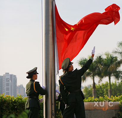 在仪式主持人学工部部长、团委书记姚祖婵宣布升旗仪式正式开始之后,校国旗护卫队便迈着整齐的步伐护送国旗入场。伴着庄严嘹亮的国歌,五星红旗冉冉升起,全体师生肃立,向国旗行注目礼。