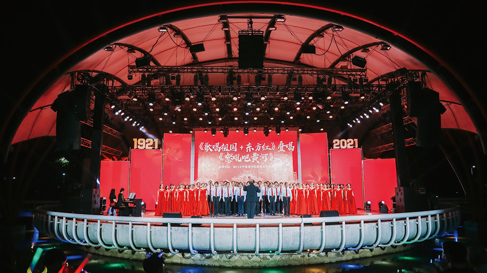 “五星红旗迎风飘扬,胜利歌声多么响亮……”在慷慨激昂的《歌唱祖国》的歌声中,厦门大学嘉庚学院庆祝建党100周年暨2021年毕业晚会拉开了帷幕。