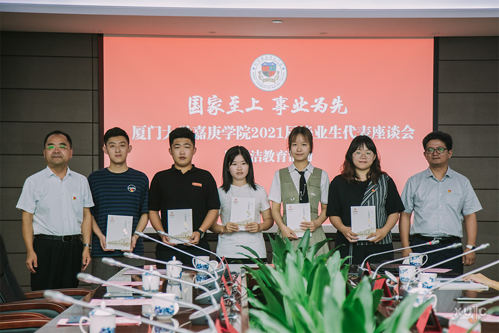 6月22日上午,“国家至上,事业为先”2021届毕业生代表座谈会暨廉洁教育活动在我校主楼群3号楼709会议室举行。漳州校区管委会主任、嘉庚学院党委常务副书记黎永强,党委副书记王洁松,院长助理姚祖婵,纪委副书记易强,机电工程学院院长方亮,管理学院党总支书记张菊香和毕业生代表们倾心交流。活动由实习与就业服务中心主任、校友会秘书处秘书长叶志筑主持。